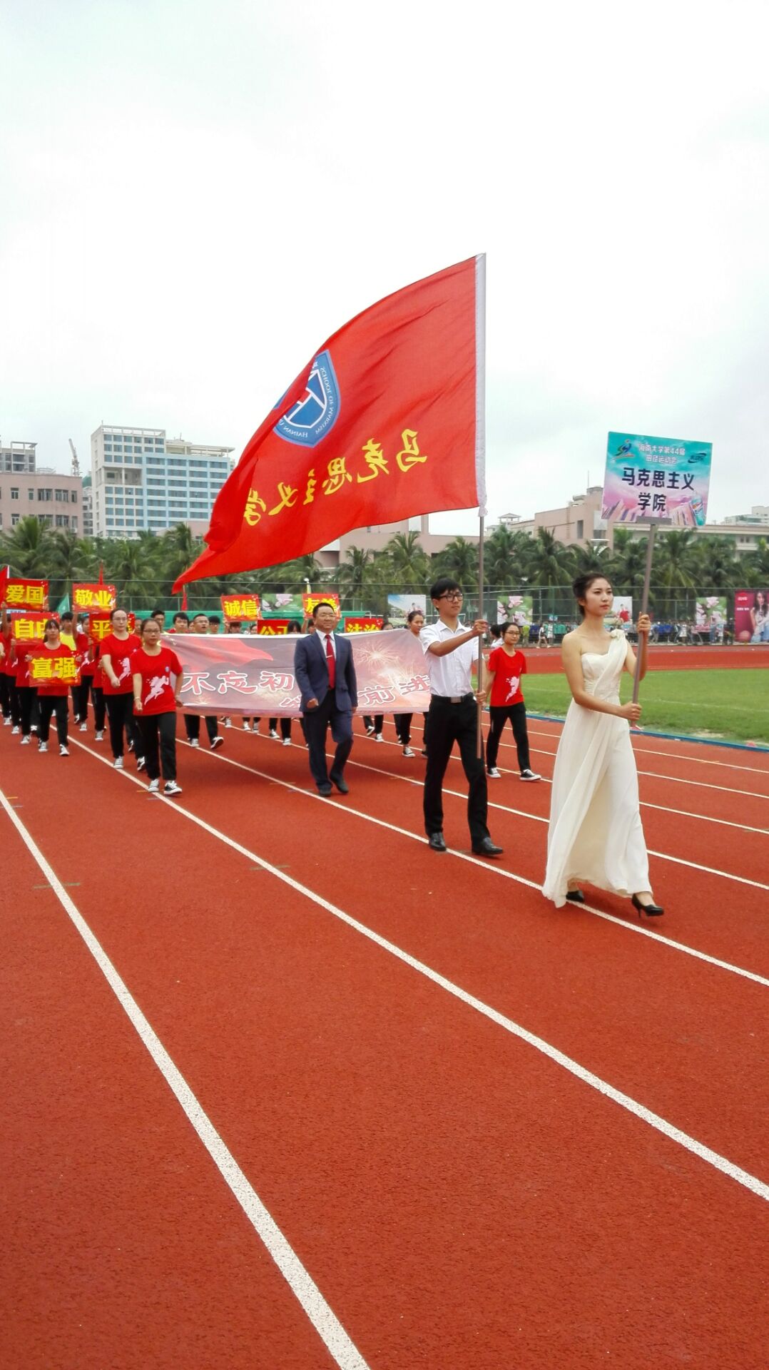开幕式上,公司师生身着“不忘初心,继续前进”的红色运动装,同时黄色运动装拼成一个大写的“人”,展现出公司以人为本的核心理念。同学们以昂扬的精神风貌步入会场,整齐划一的服装,坚定有力的步伐,气壮山河的口号,处处显示出公司学子积极向上的面貌,为全校师生呈现了一场富有公司特色的红色精神盛宴,赢得了阵阵掌声。“不忘初心,继续前进”寓意着公司不仅会继续发扬艰苦奋斗、勇于开拓的红色精神,还会继续坚持“四个全面”战略布局,与时俱进,不断创新。