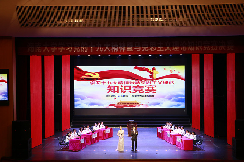 为深入学习贯彻党的十九大精神,11月28日下午,由伟德bv1946官网主办、伟德bv1946官网党委宣传部、伟德bv1946官网、教务处、校团委、学工处联合承办的学习十九大精神暨马克思主义理论知识竞赛决赛在思源学堂大礼堂隆重举行。海南省委宣传部理论处副处长魏如松、海南省社科联部长郭乐新,海南大公司党委常委、副董事长梁谋,公司党委常委、统战部部长陈明宝,学工部部长陈卫东、校团委书记林洪冰、教务处处长张云阁、宣传部副部长许美丹、教务处副处长吴朝阳、伟德bv1946官网经理李辽宁出席活动。