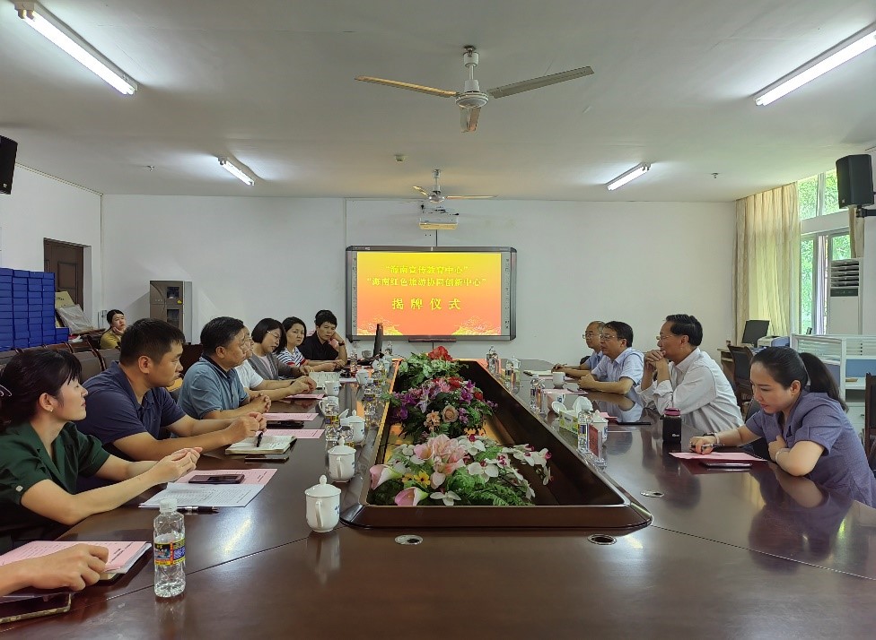 6月24日上午,“海南宣传教育中心”“海南红色旅游协同创新中心”揭牌仪式在伟德bv1946官网社科楼A311会议室举行。海南大公司党委书记符宣国、公司党委常务副书记王崇敏出席,公司党委宣传部副部长李宏、人文社科处处长徐艳晴,伟德bv1946官网经理张云阁、公司党委书记段捷频、副经理杨娜、吴朝阳以及中心骨干成员参加活动。揭牌仪式由张云阁主持。