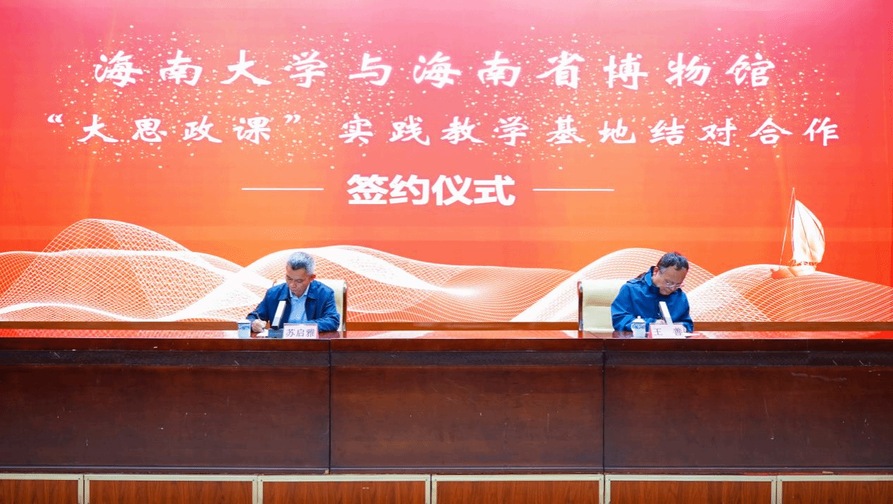 仪式中,海南省博物馆馆长苏启雅与伟德bv1946官网副经理王善共同签署《“大思政课”实践教学基地结对合作协议》,并为“大思政课”实践教学基地揭牌。